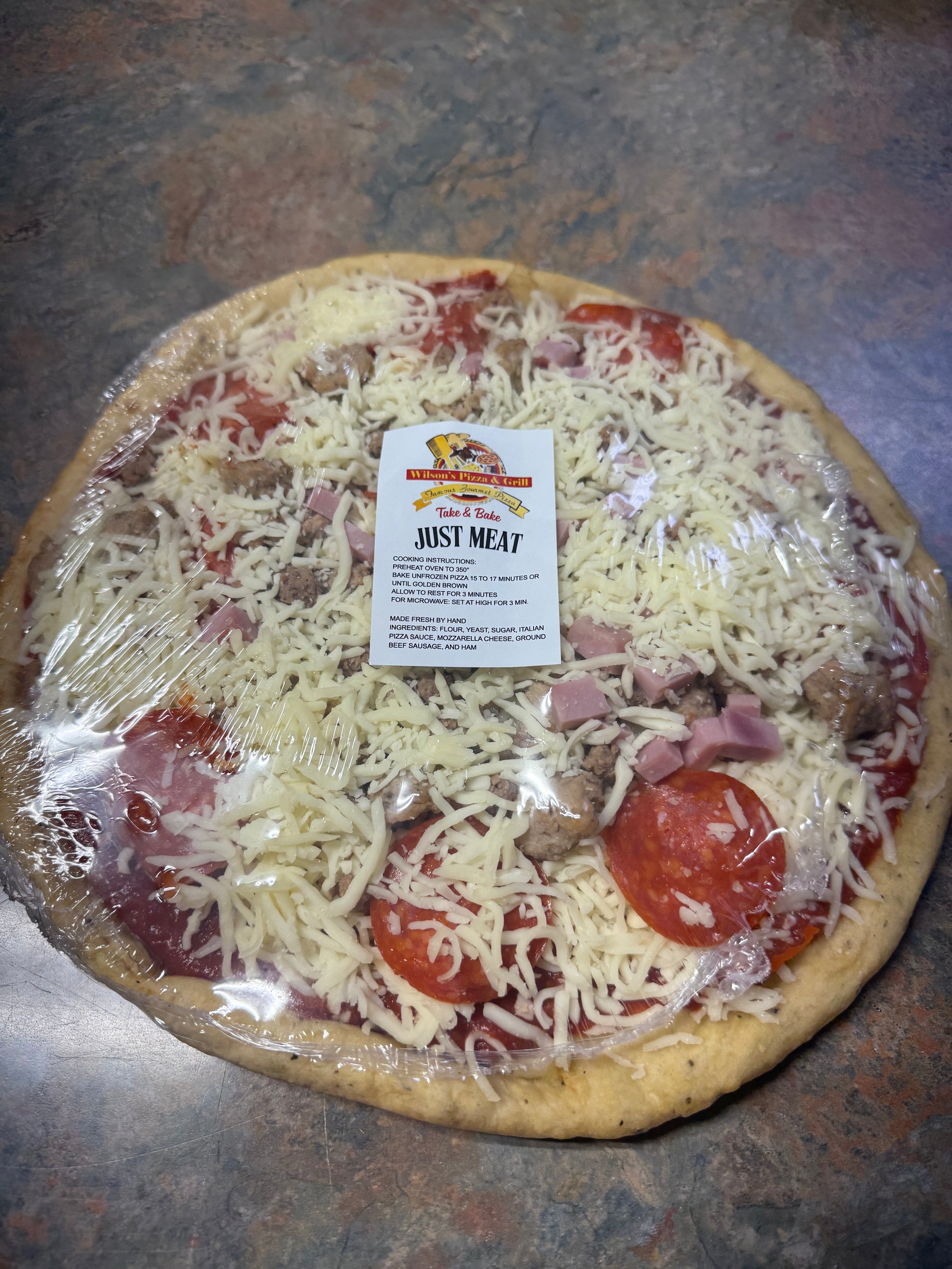 - Wilson’s Just Meat Take & Bake: Carnivore’s dream loaded with pepperoni, Italian sausage, ground beef, and Canadian bacon, all nestled in our signature sauce and blanketed in melted cheese for bold, hearty bites.